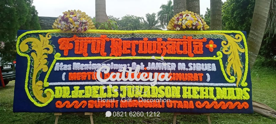 Karangan bunga papan gandeng model kota Medan dengan paduan 2 mahkota bunga segar di atas papan